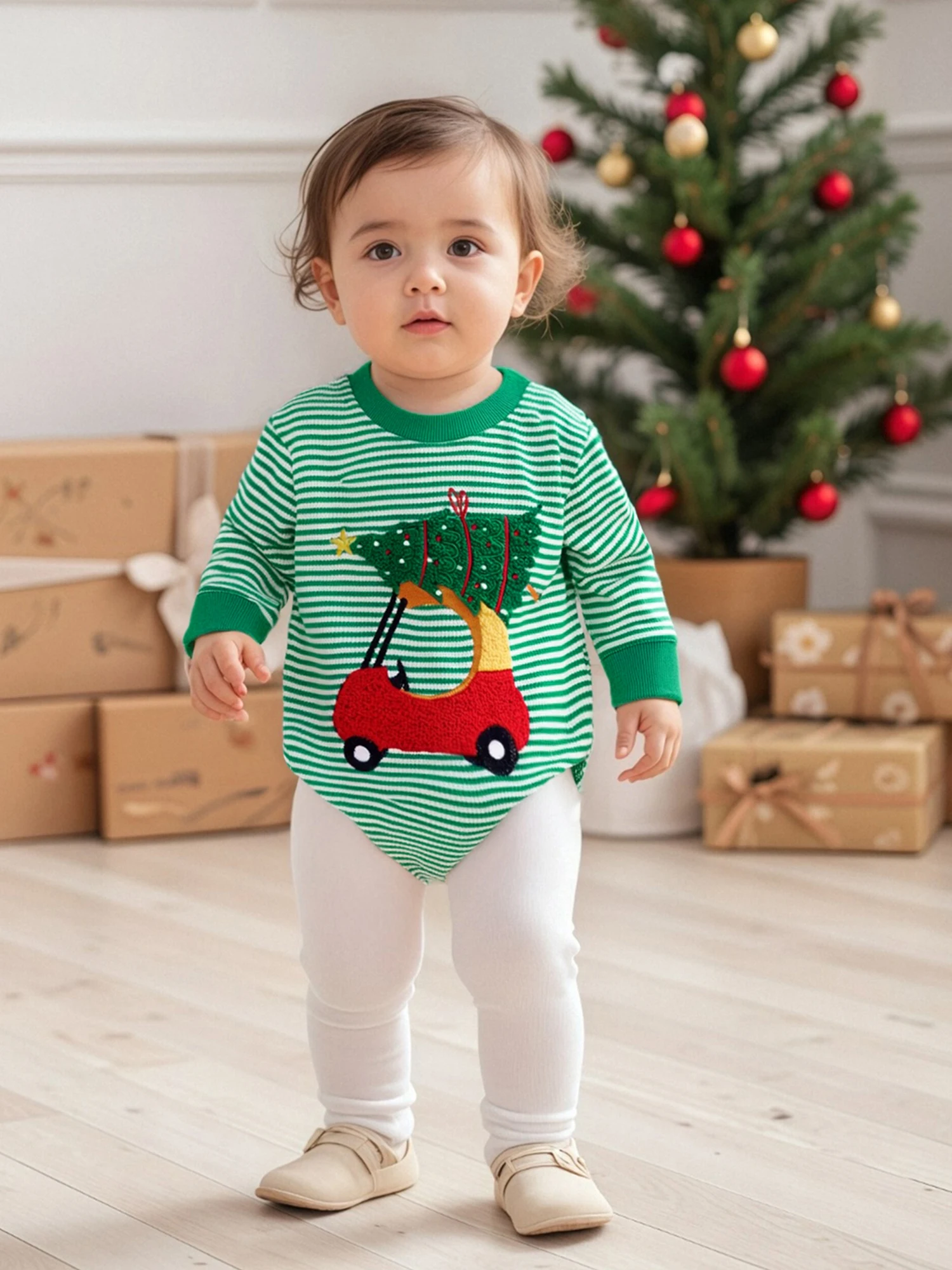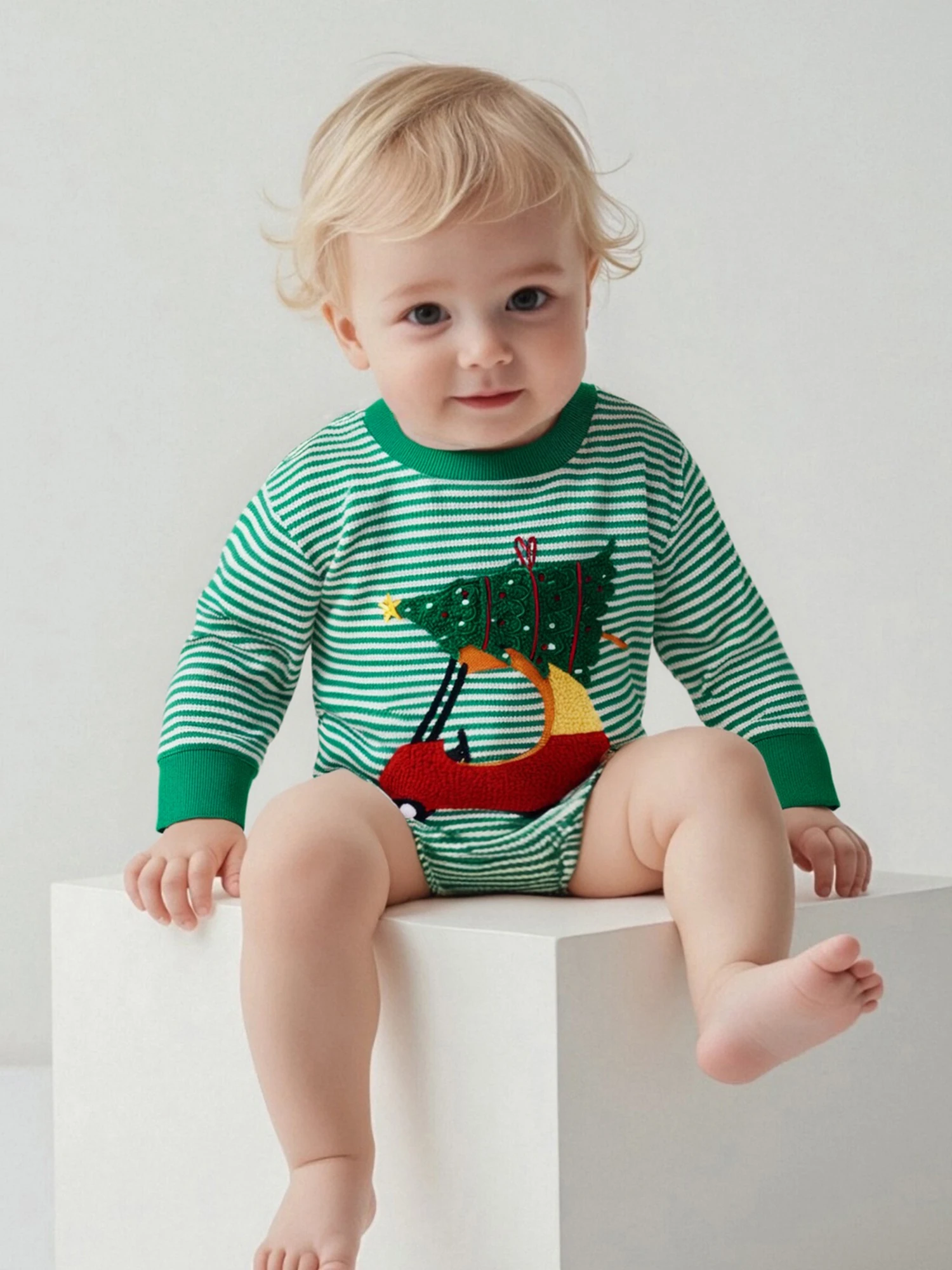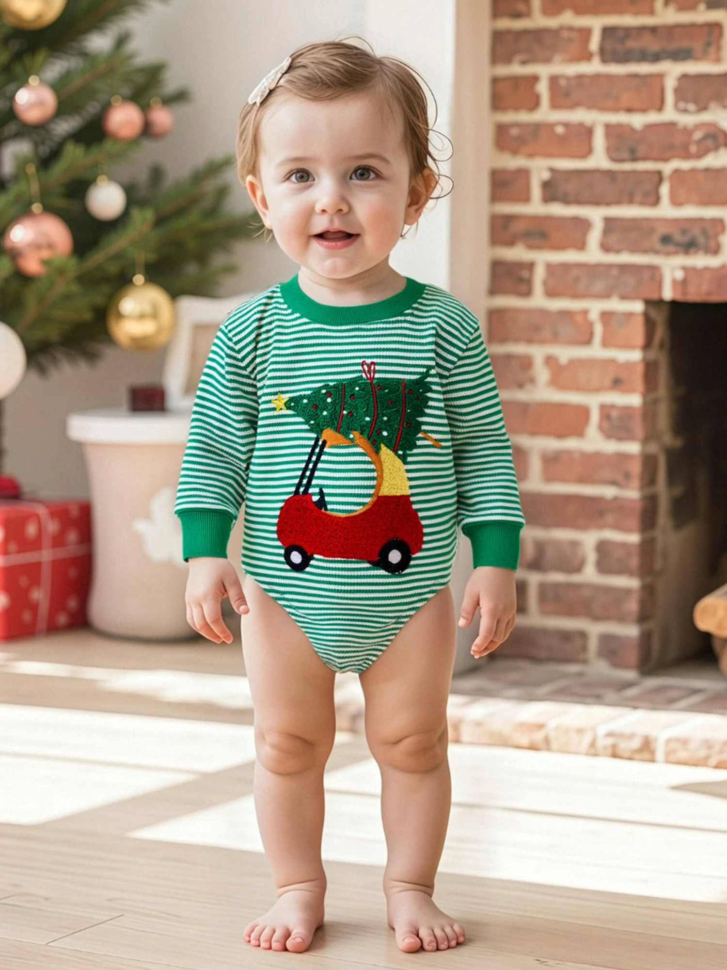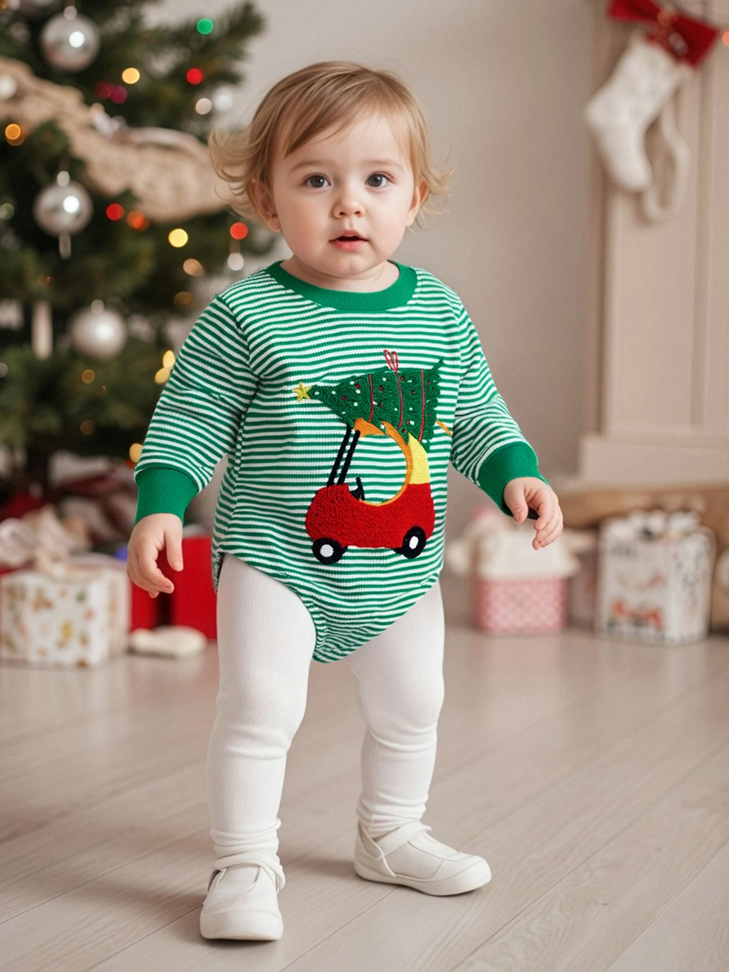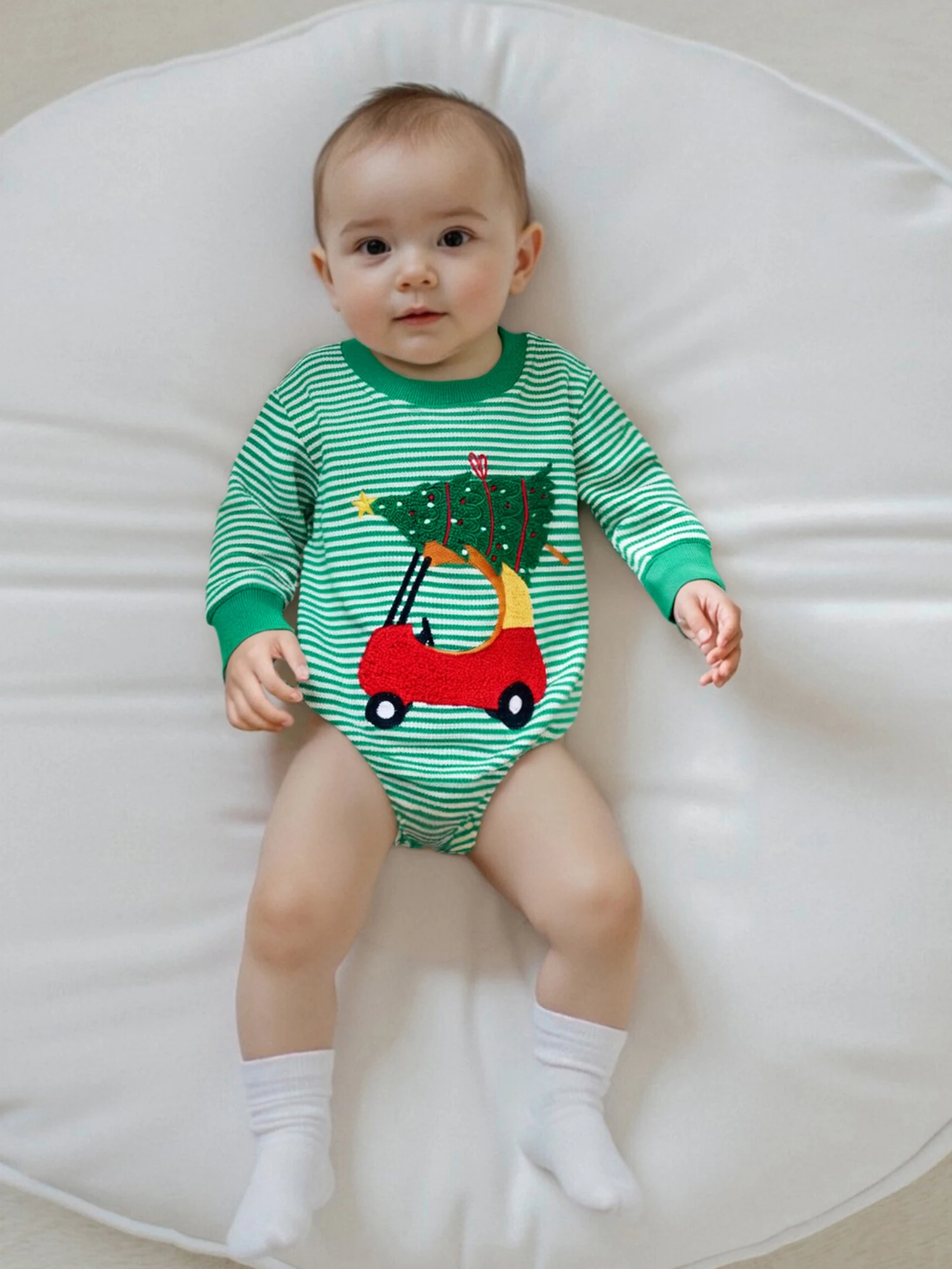 Baby Striped Romper Fashionable Santa/Christmas Tree Embroidery Round Neck Long Sleeve Jumpsuit