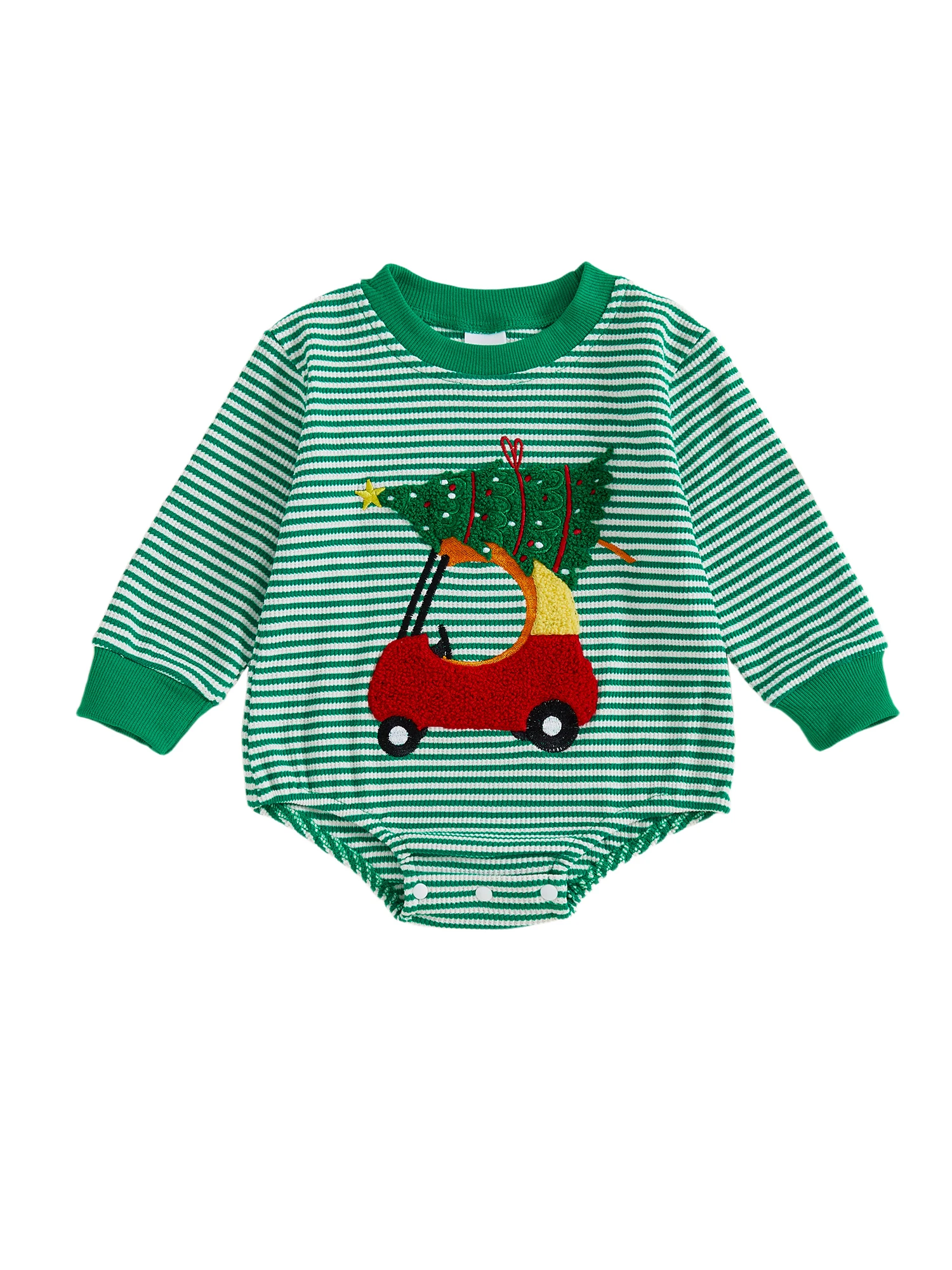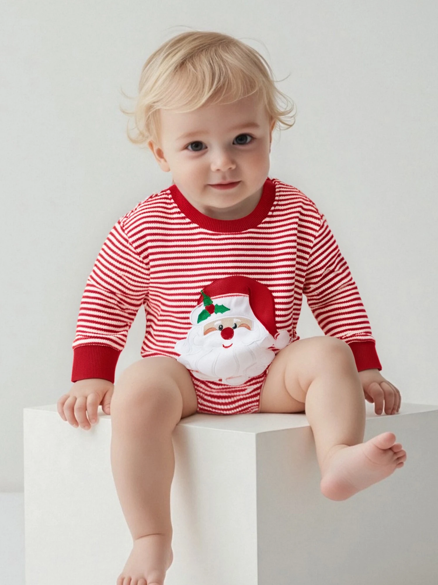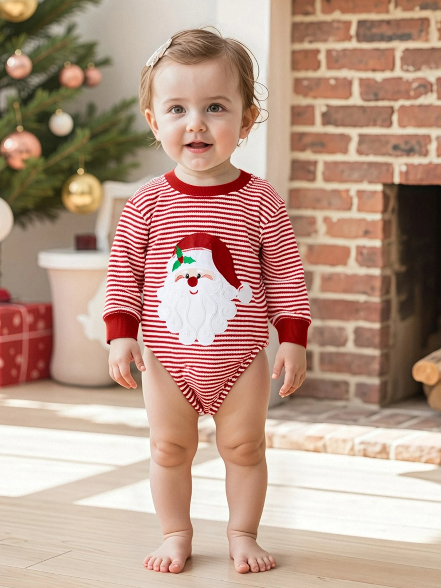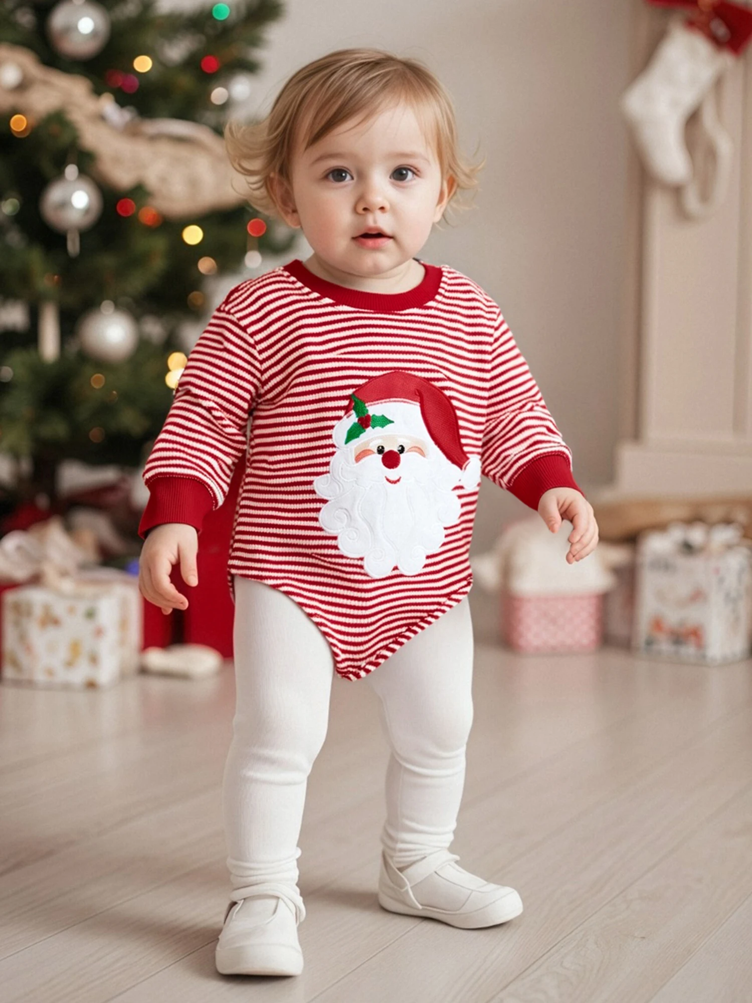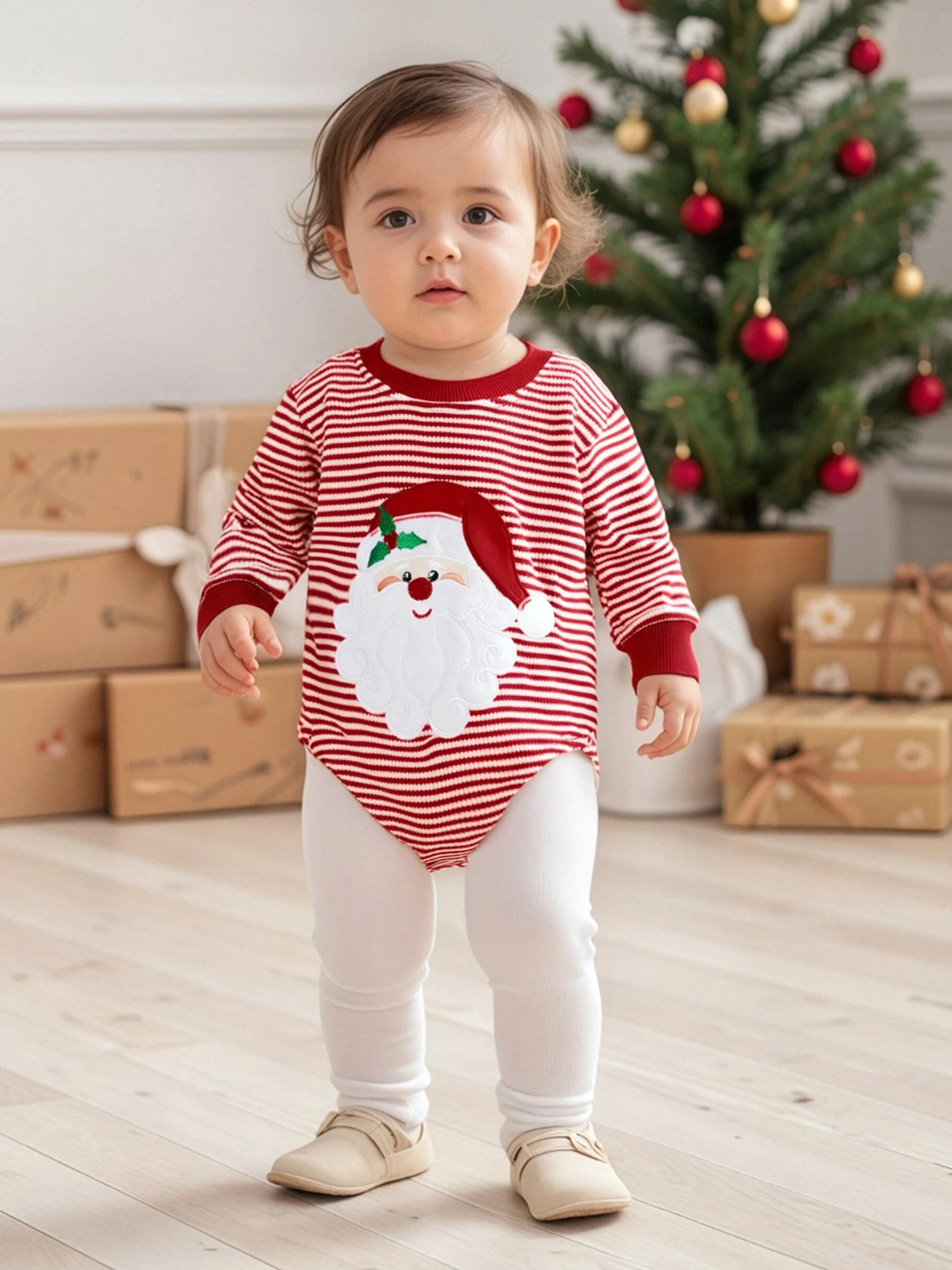 Baby Striped Romper Fashionable Santa/Christmas Tree Embroidery Round Neck Long Sleeve Jumpsuit