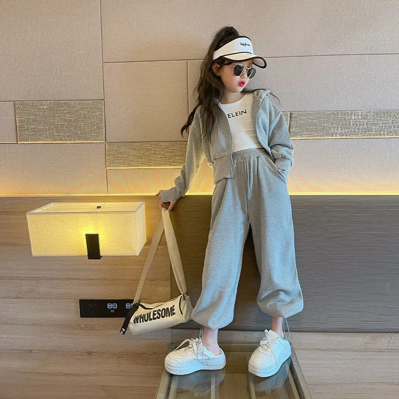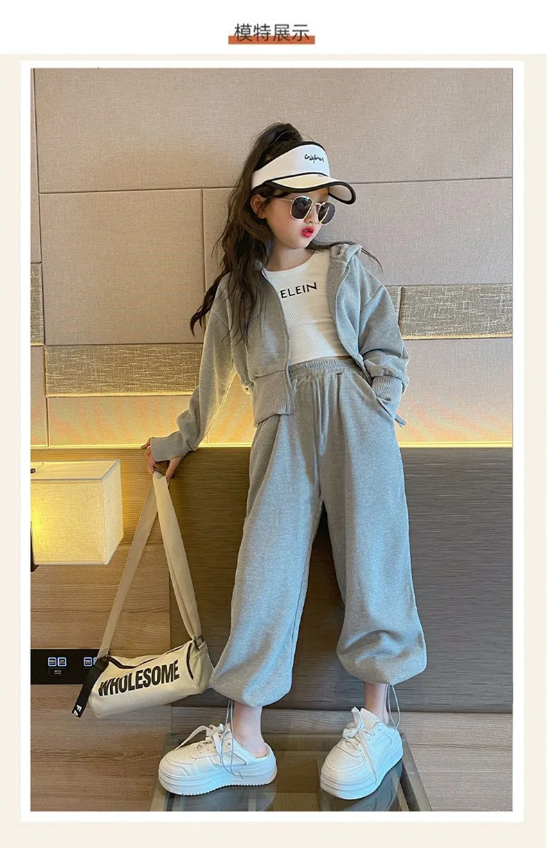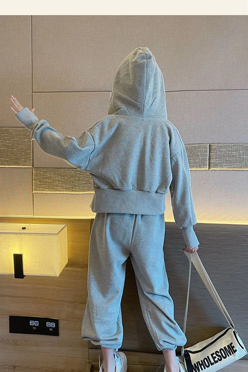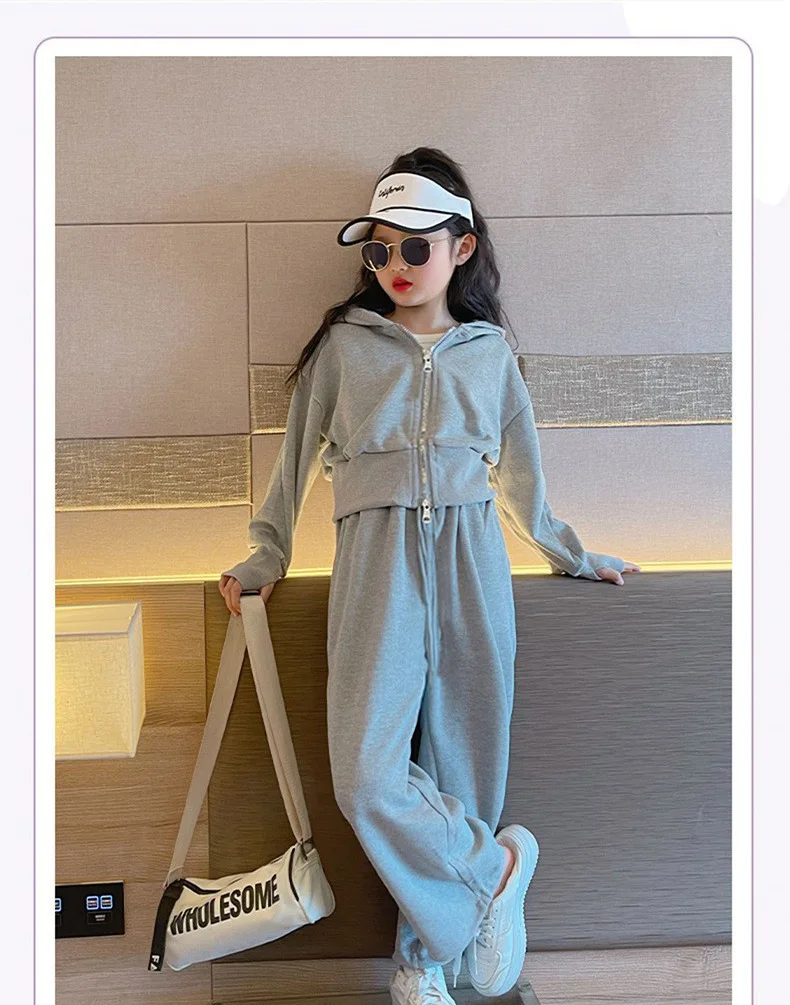 2025 autumn winter Girl grey Teens tracksuit zipper crop top Jacket hooded top and bottom wide leg pant child set 4 8 10 12 year