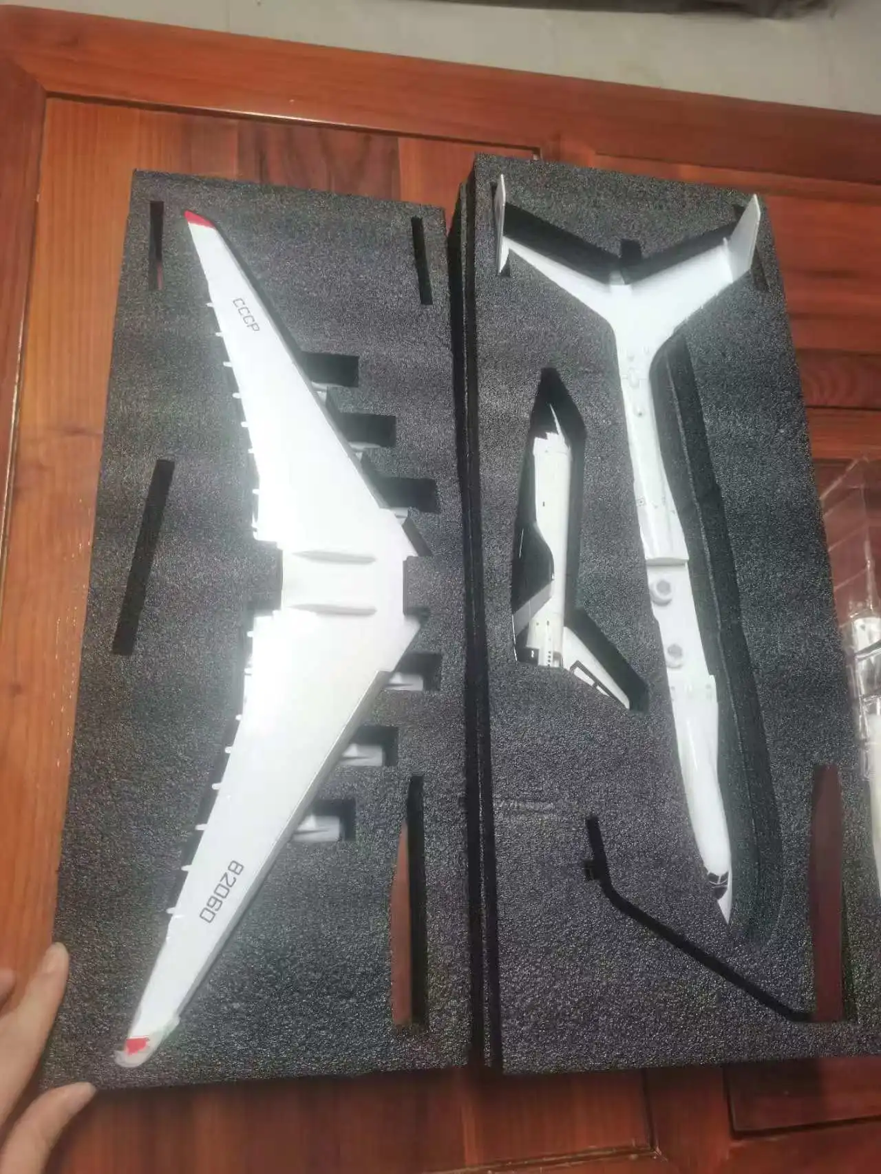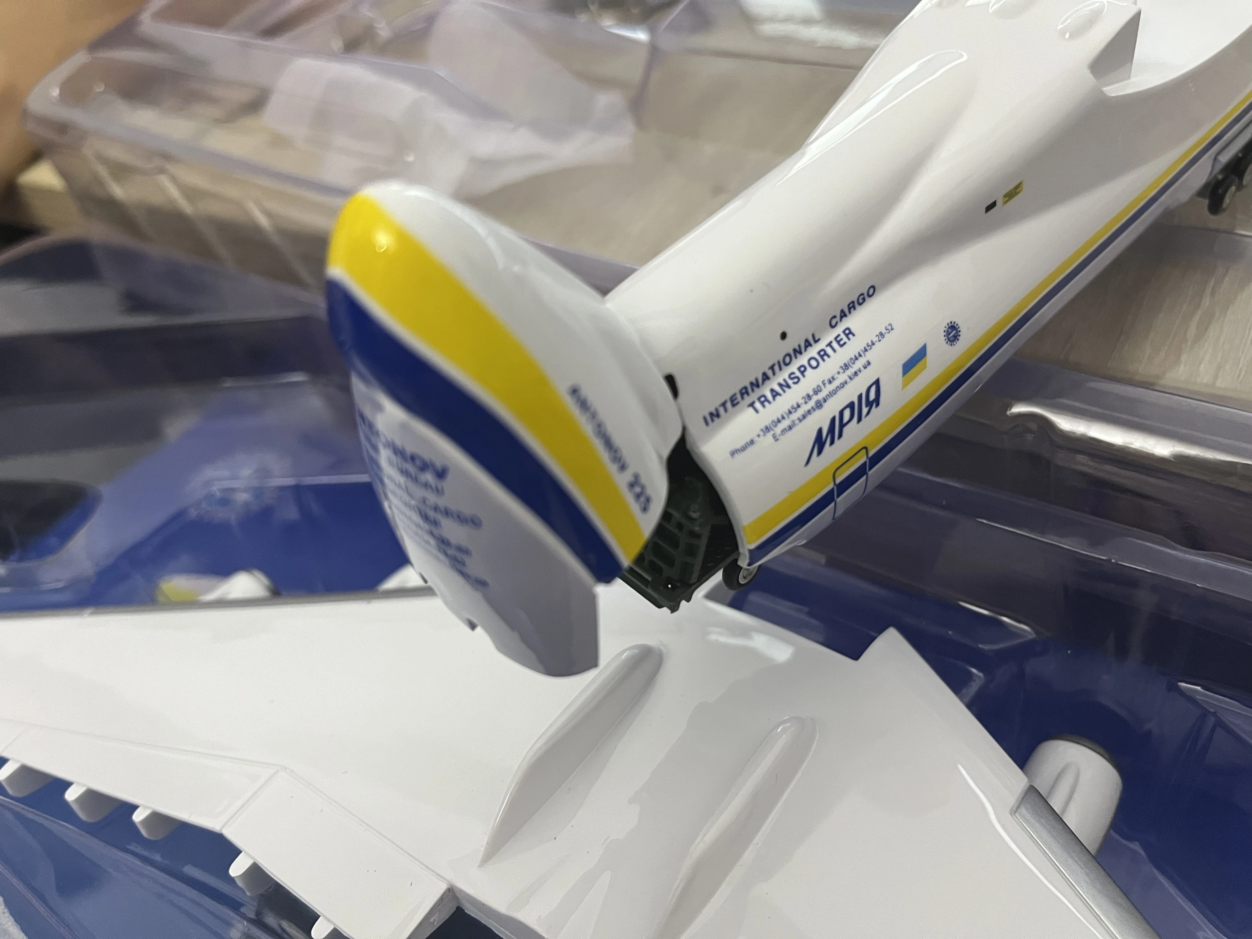 The aircraft features a length of 16.7 inches and weighs 2.2 pounds. The nose can be opened, and the loading and unloading ramp can be folded for storage. It's a high-fidelity resin model of the Ukrainian Antonov An-225 Mriya transport aircraft. The aircraft, including the nose, is designed to be detachable and replaceable