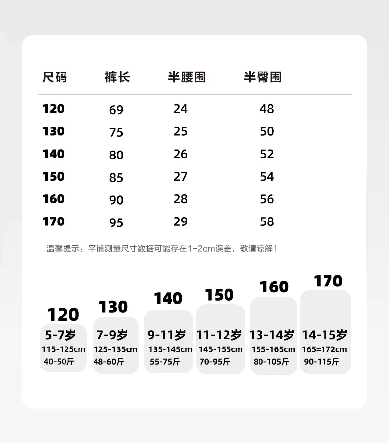 Warm prompt:Dear customer, because the label of each country is different,-There is 2-3cm difference according to manual measurement.so please check the detailed measurements, according to the child's height and weight to choose the right size, if you have any questions, please send information to us, we will reply within 12 hours, thank you !