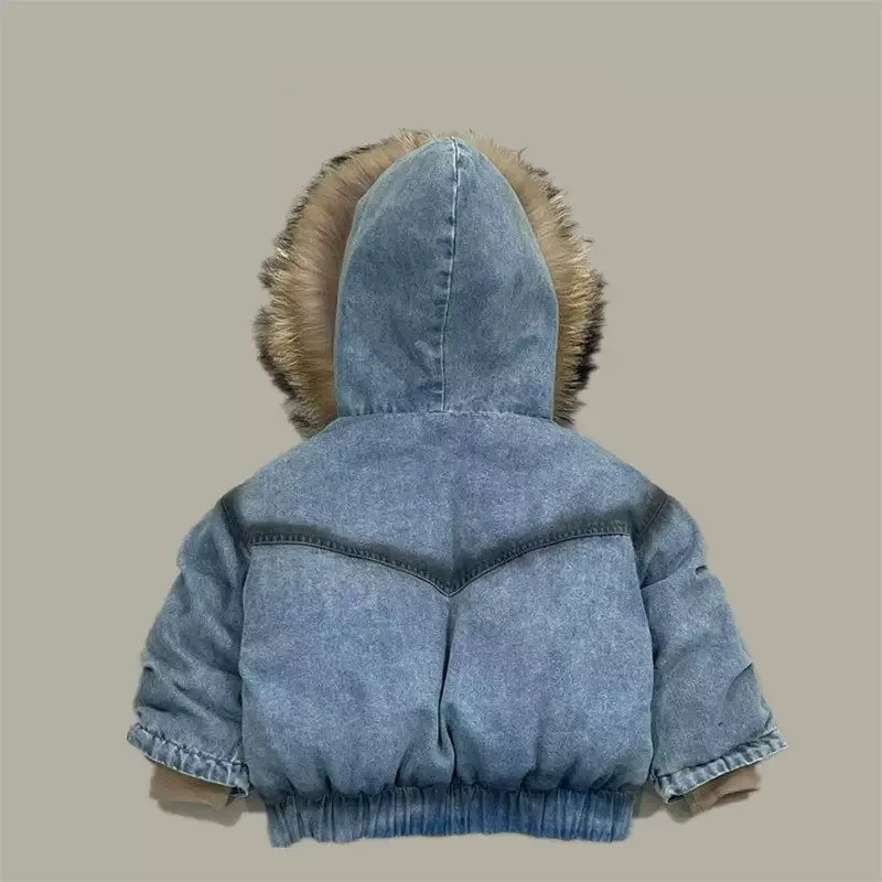Children Boys Winter Jackets Denim Padded Outerwear Coat For 4-14Y Kids Boys Faux Fur Hooded Young Teens Boys Warm Parkas