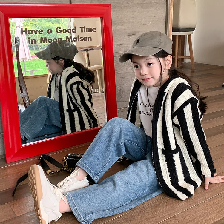Childrens Jeans Good Fit High-quality Girls Autumn Fashionable and Versatile Washed Elastic Retro Straight Leg Jeans