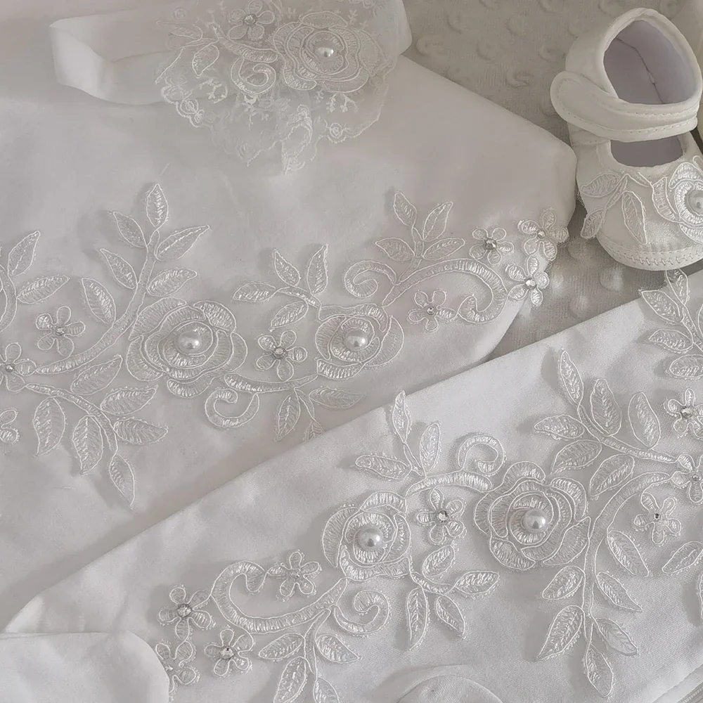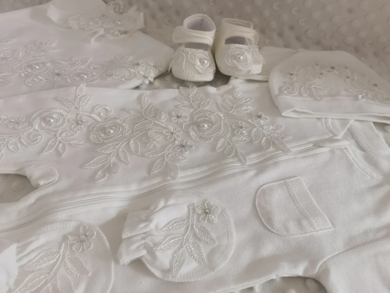 Set Includes: Jeweled Layette, hat, mittens, shoes, blanket
