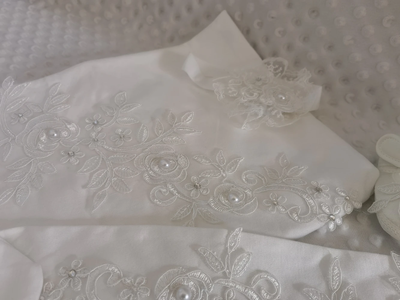 This luxury layette is made of softrich pink and white cotton.