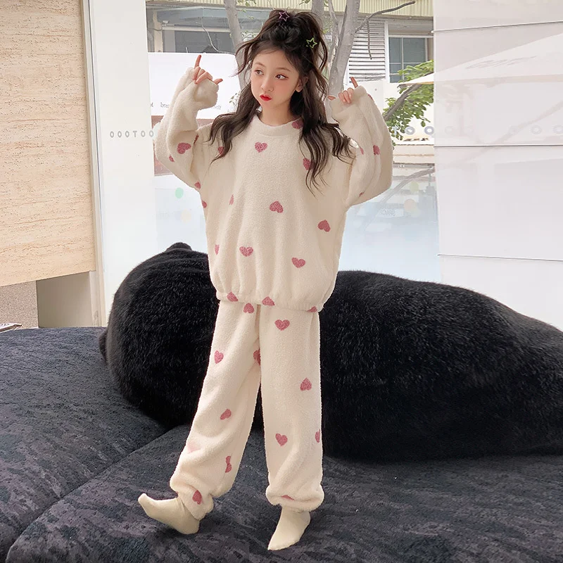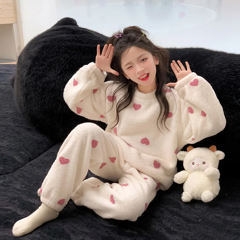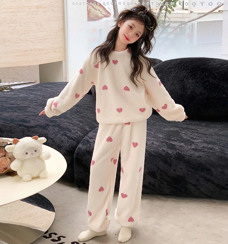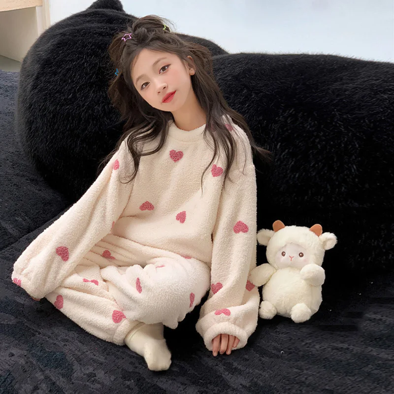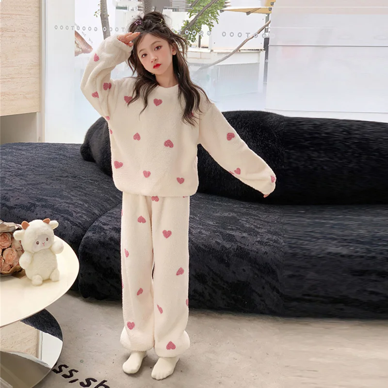 Girls Fleece Suits Kids Warm Padded Pajamas+Pants 2Pcs Outfits Children Autumn Winter Sets Teenager Soft Comfortable Clothing