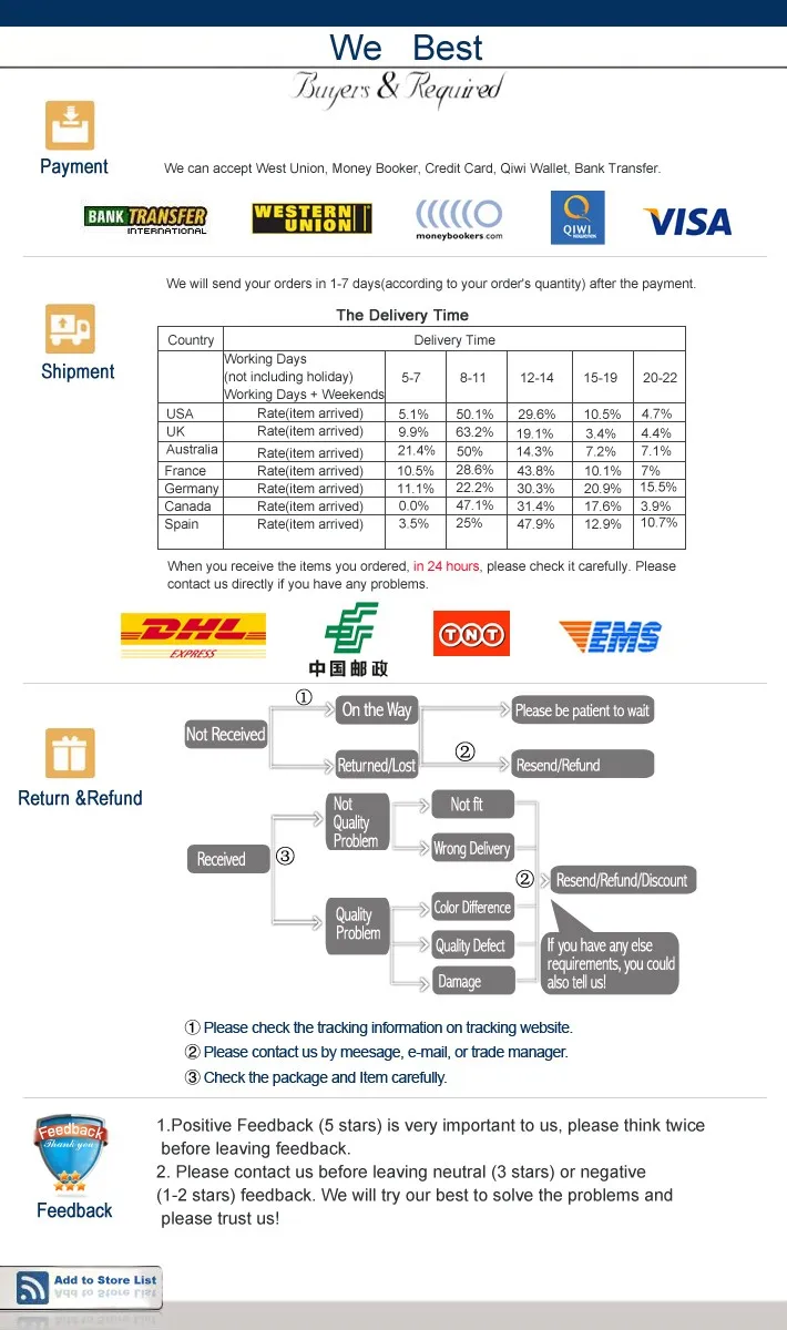 2.Please contact us before leaving any negative or neutral feedback. We will work with you to solve any problems.Thank you!