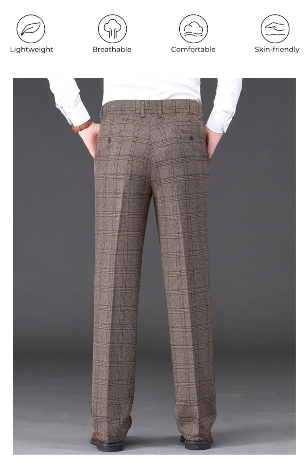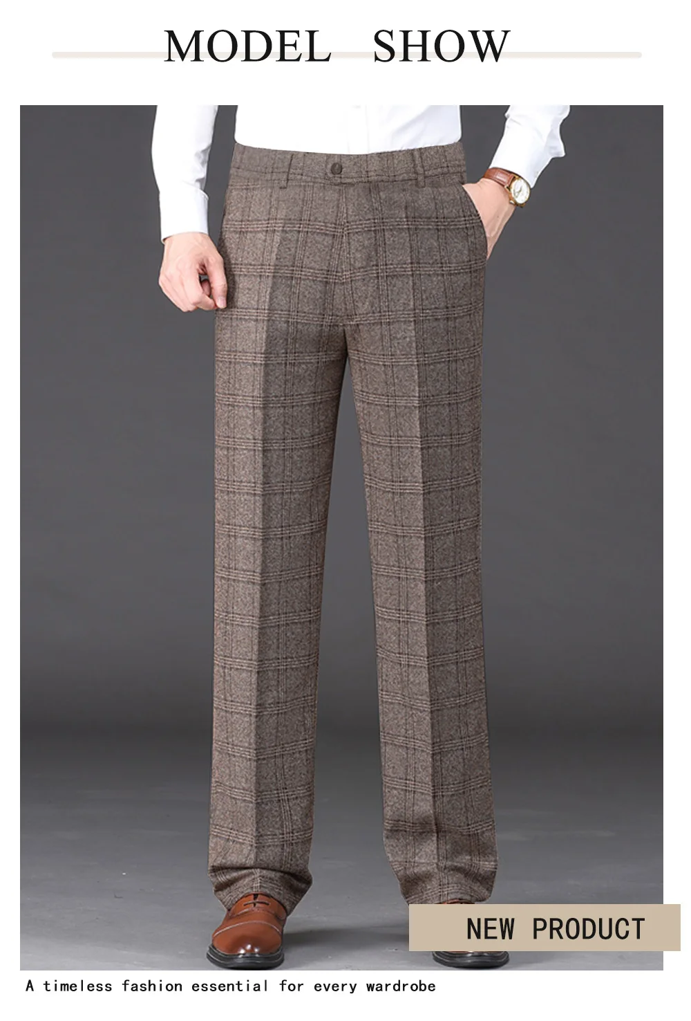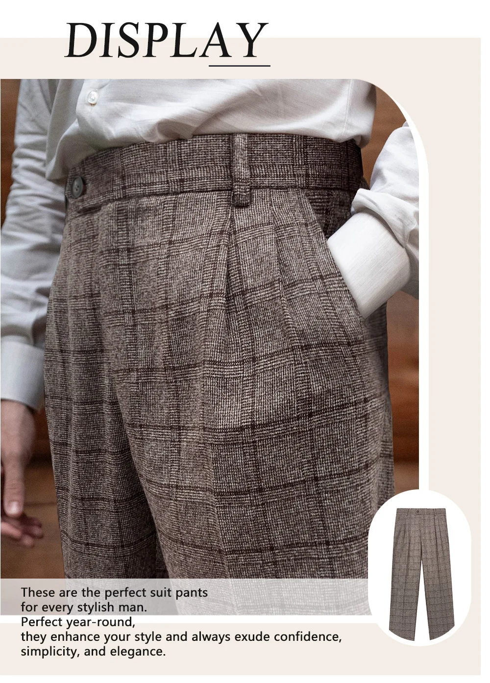 Men's Elegant Neapolitan Woolen Trousers Autumn Winter New Style Slim Fit High Waist Straight Leg Dress Pants with Checkered But