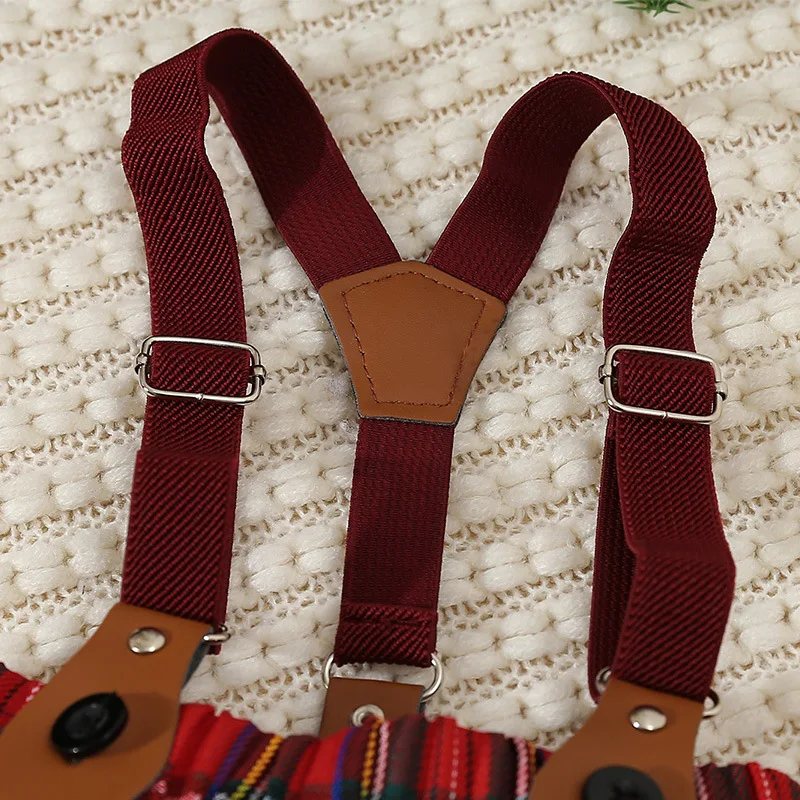 My First Christmas Baby Boys Outfits Necktie Bodysuit+Plaid Waistcoat+Suspender Pants 4pcs Formal Suit For Baby New Year Costume