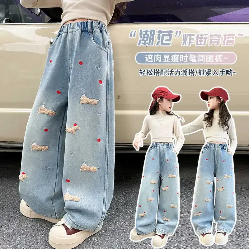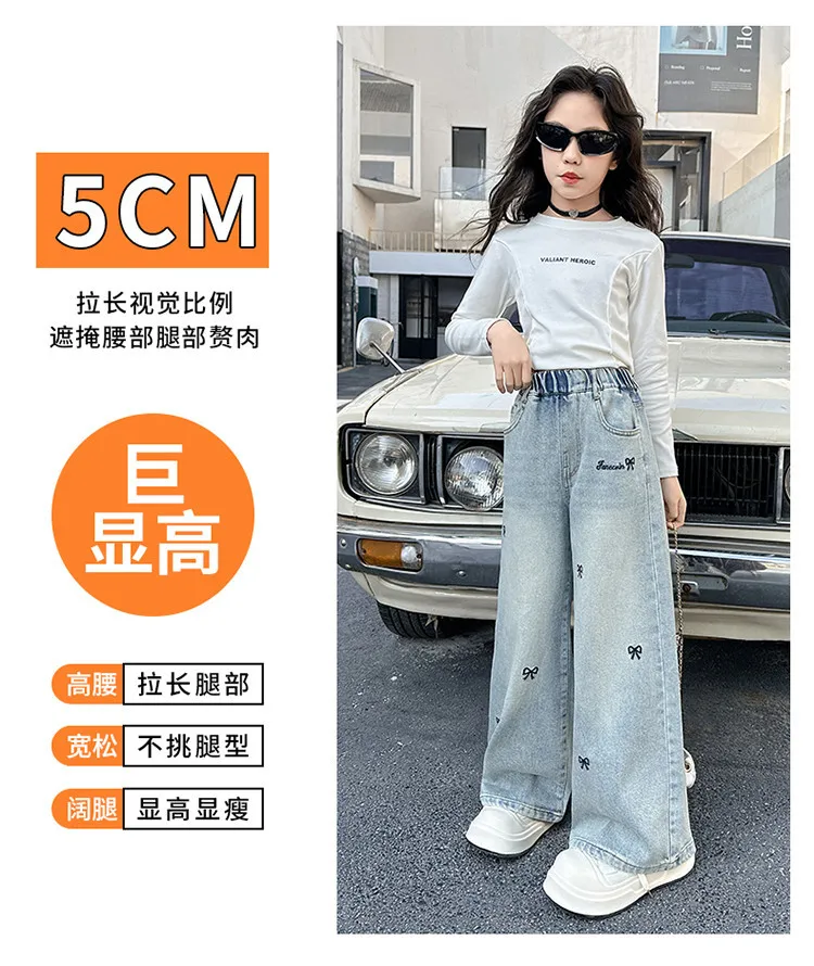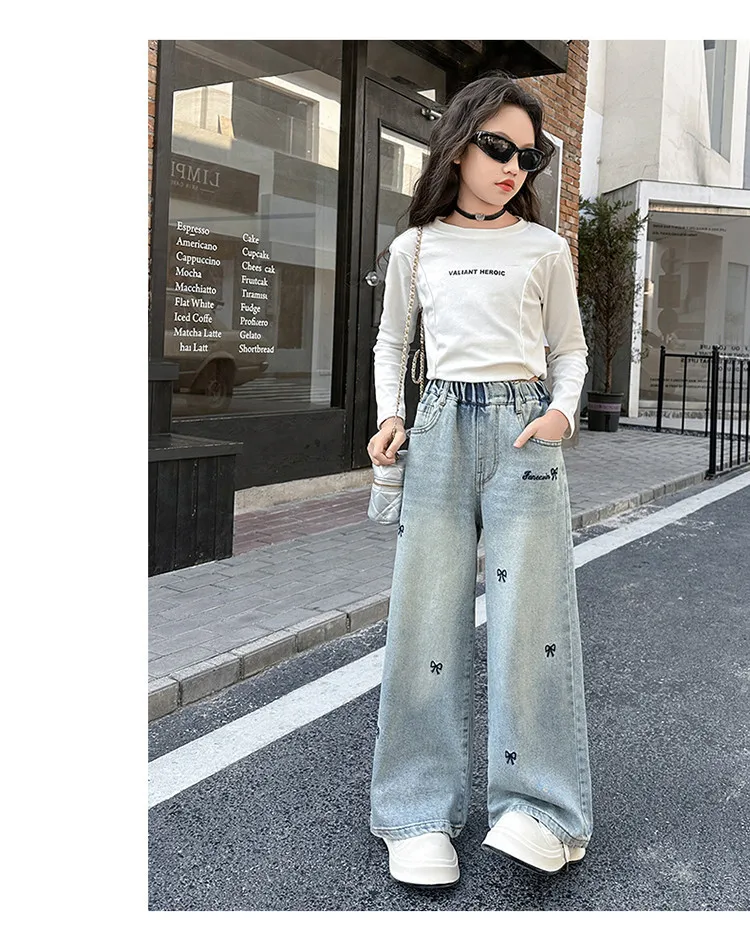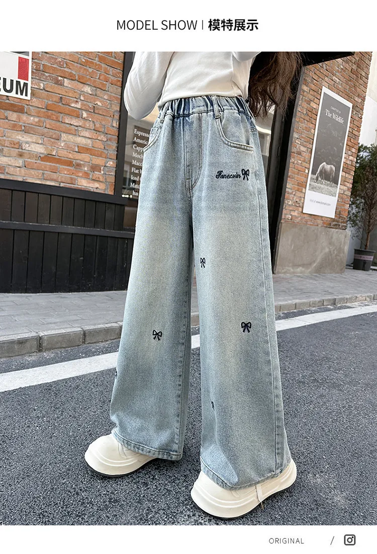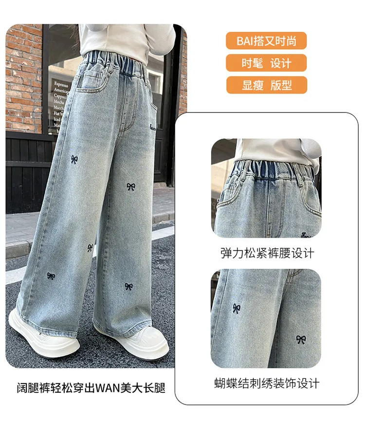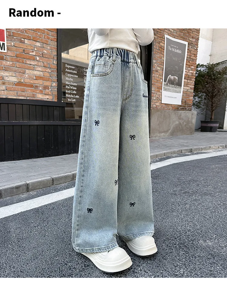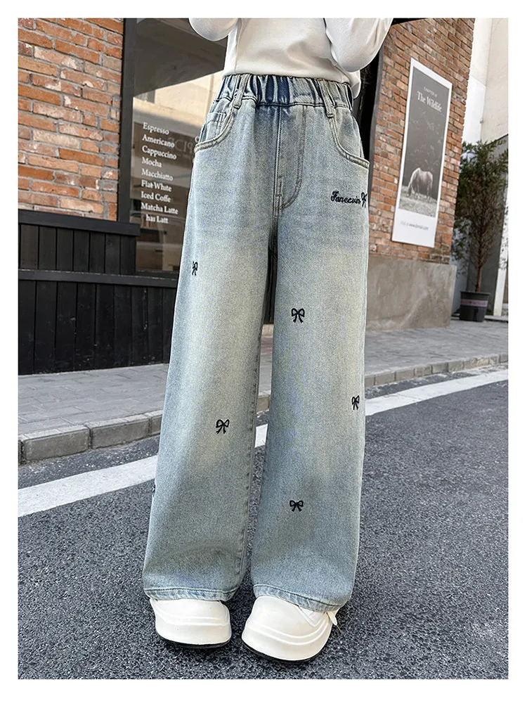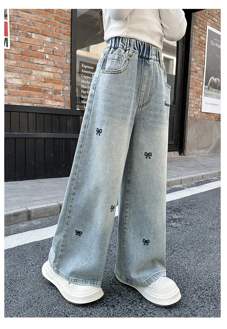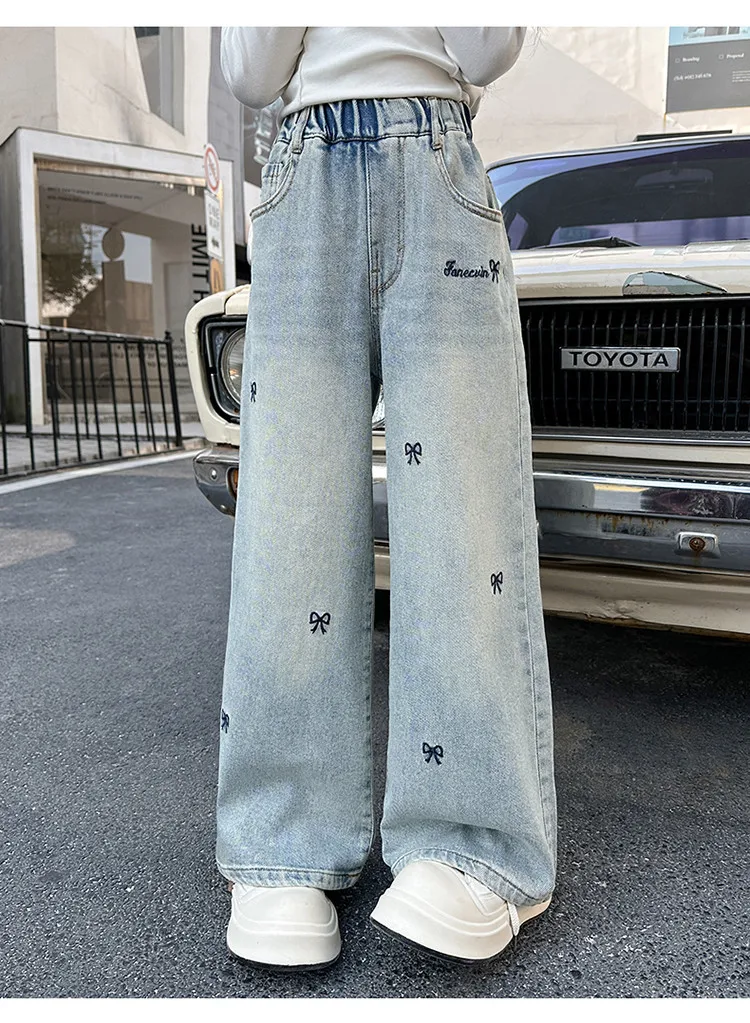 New 4-14 Years Spring Autumn Teenage Girls Jeans Full Print Bow Embroidery Fashion Wide-leg Denim Pants For Kids