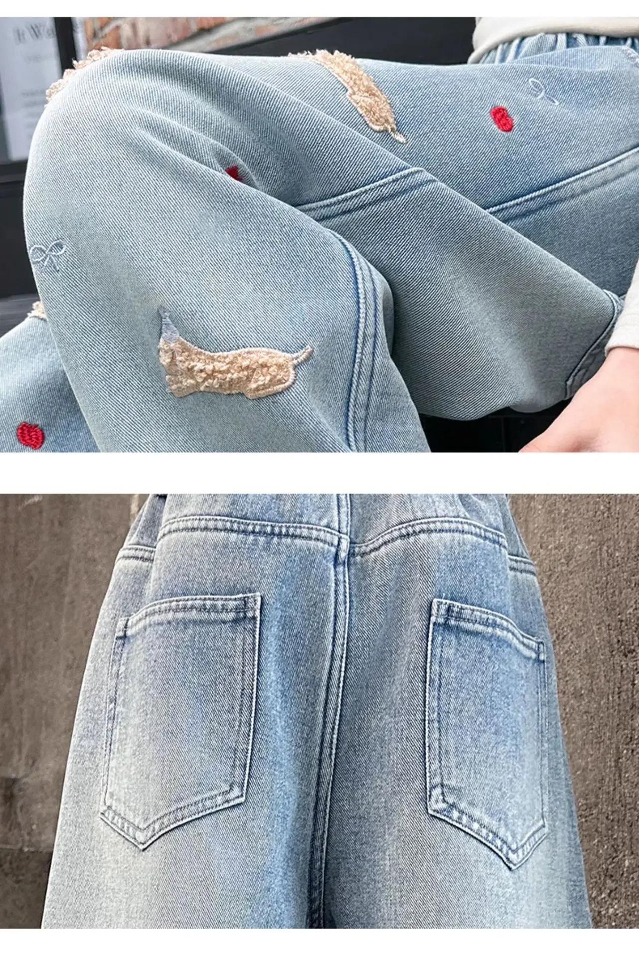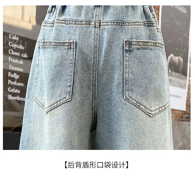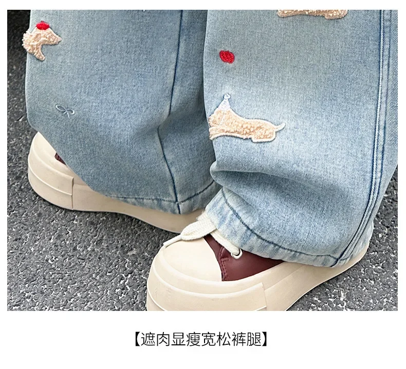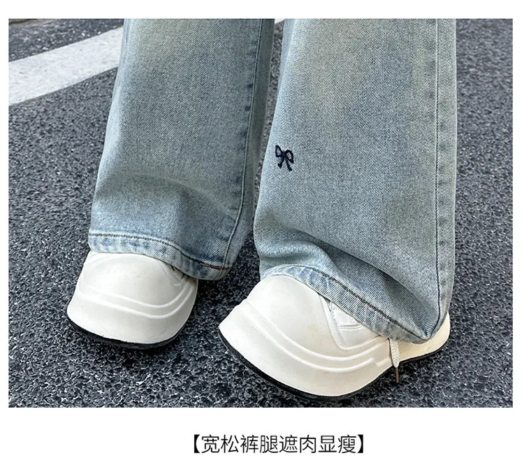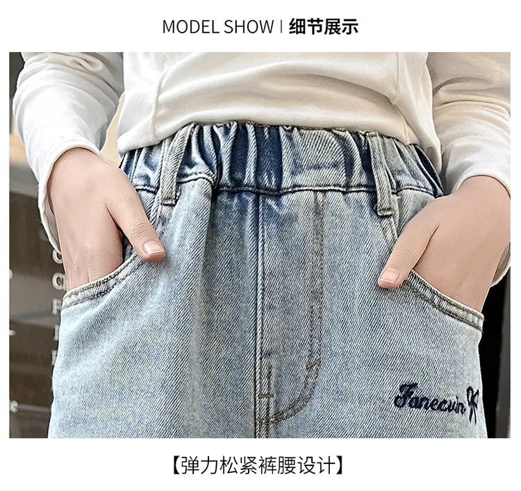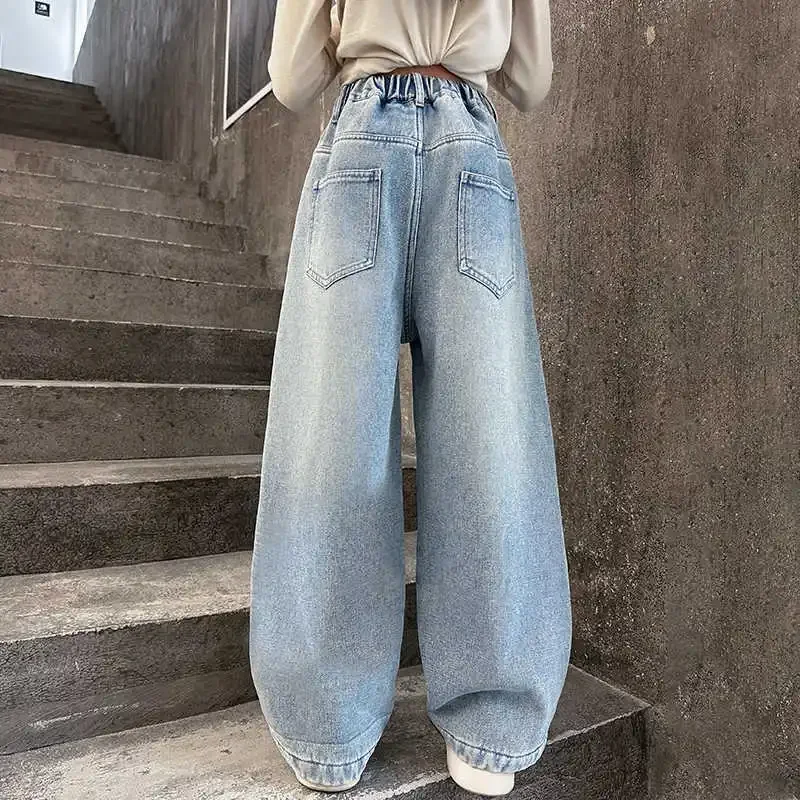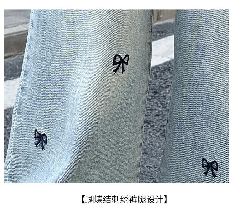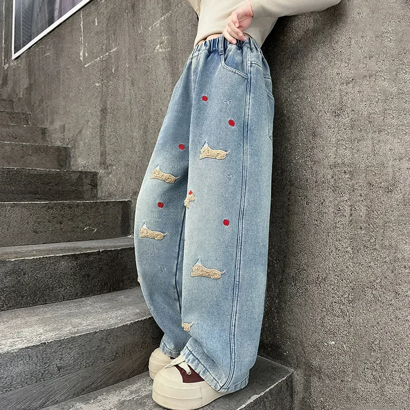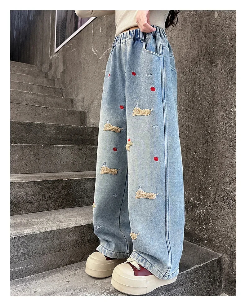 New 4-14 Years Spring Autumn Teenage Girls Jeans Full Print Bow Embroidery Fashion Wide-leg Denim Pants For Kids