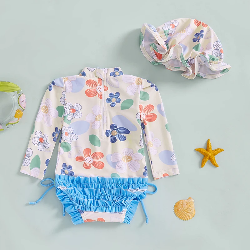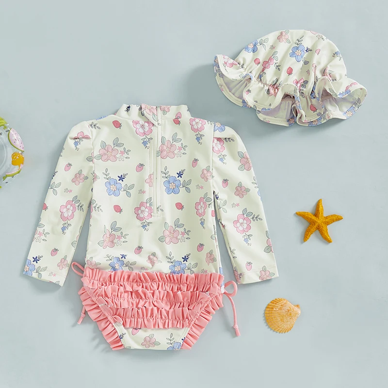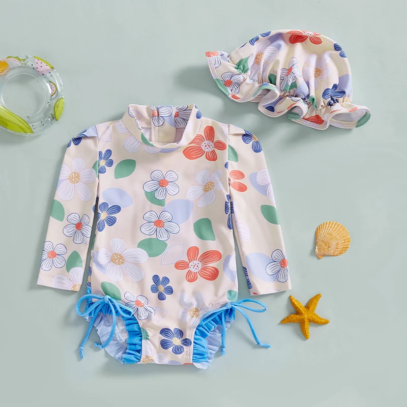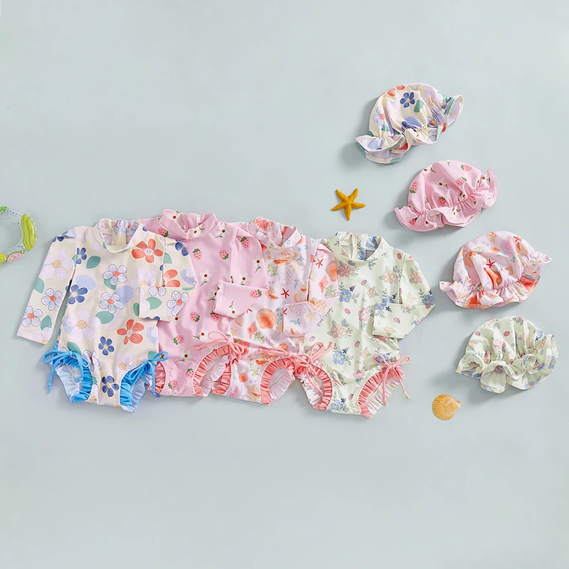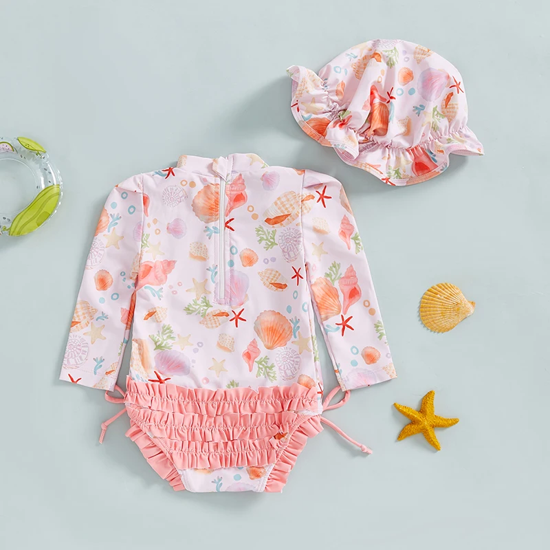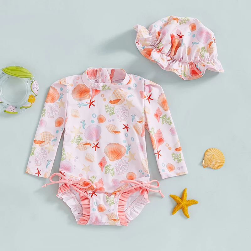 Newborn Baby Girl Swimsuit Summer Adorable Floral/Shell Print Long Sleeve Mock Neck Bathing Suit with Hat Rash Guard Swimwears