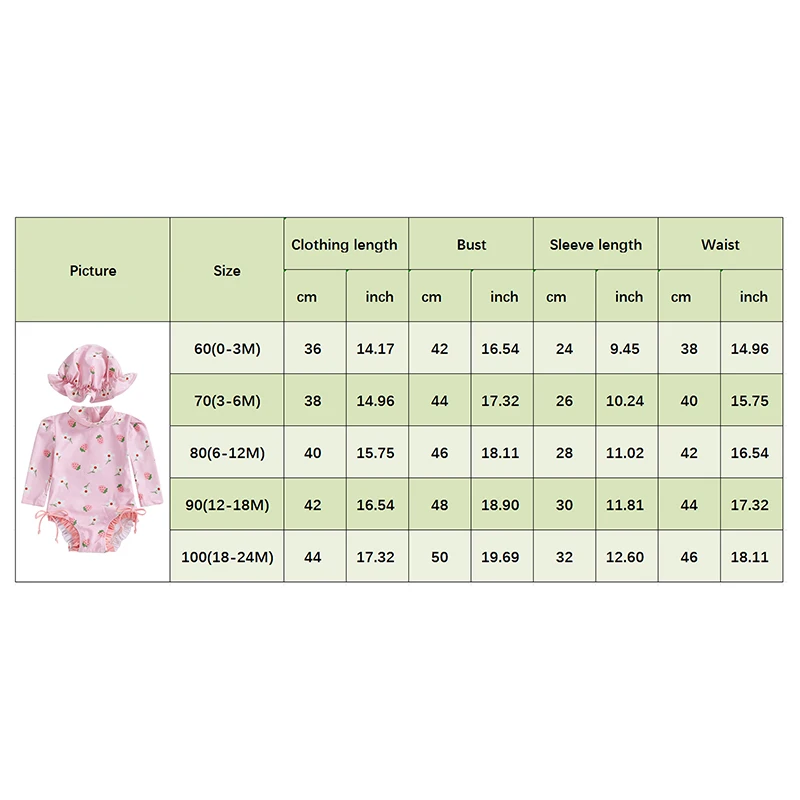 3-6M Length: 14.96 Bust: 17.32 Sleeve: 10.24 Waist: 15.75 Advised Age: 3-6 Months