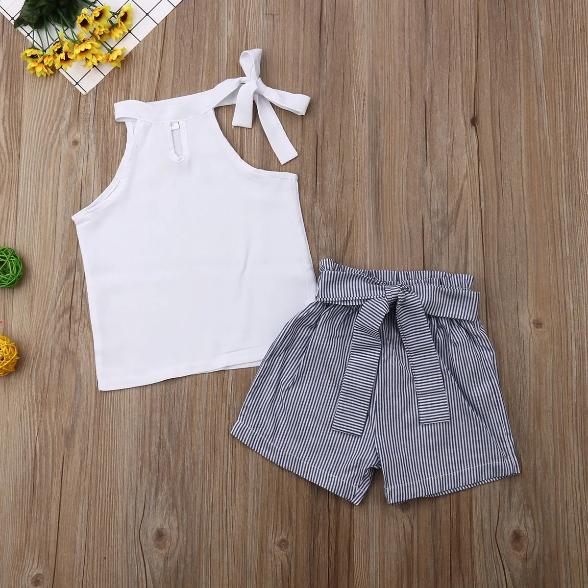 Pudcoco Summer Baby Girl Clothes Sets Sleeveless T-shirt + Striped Shorts Suits Children Girl Clothes 2-7Years