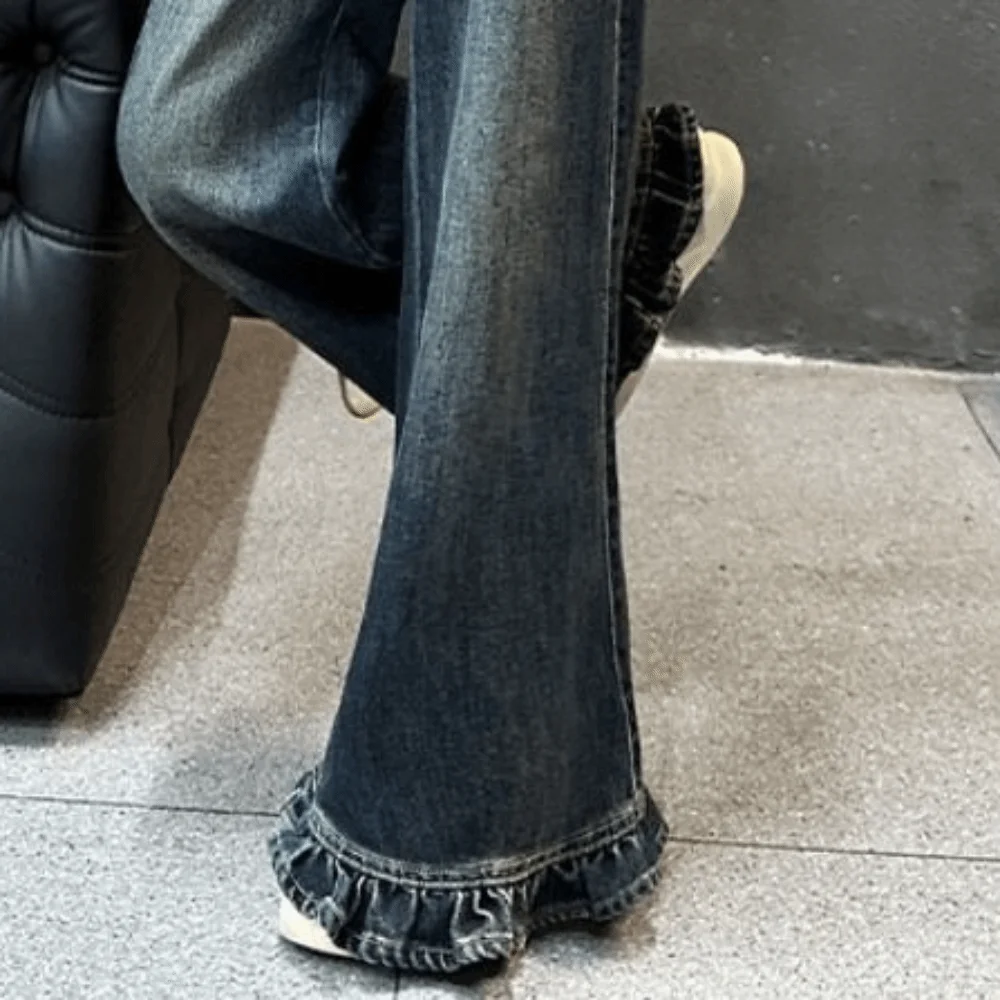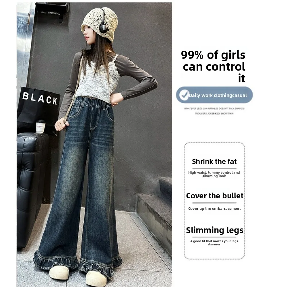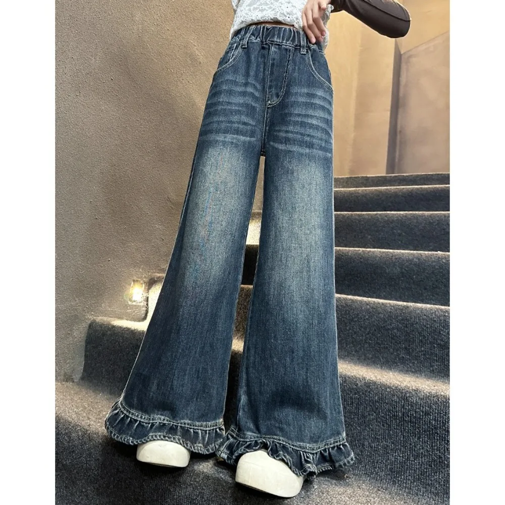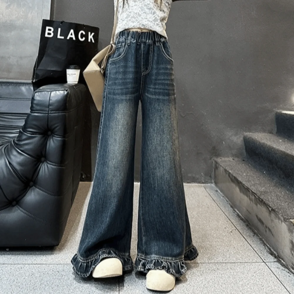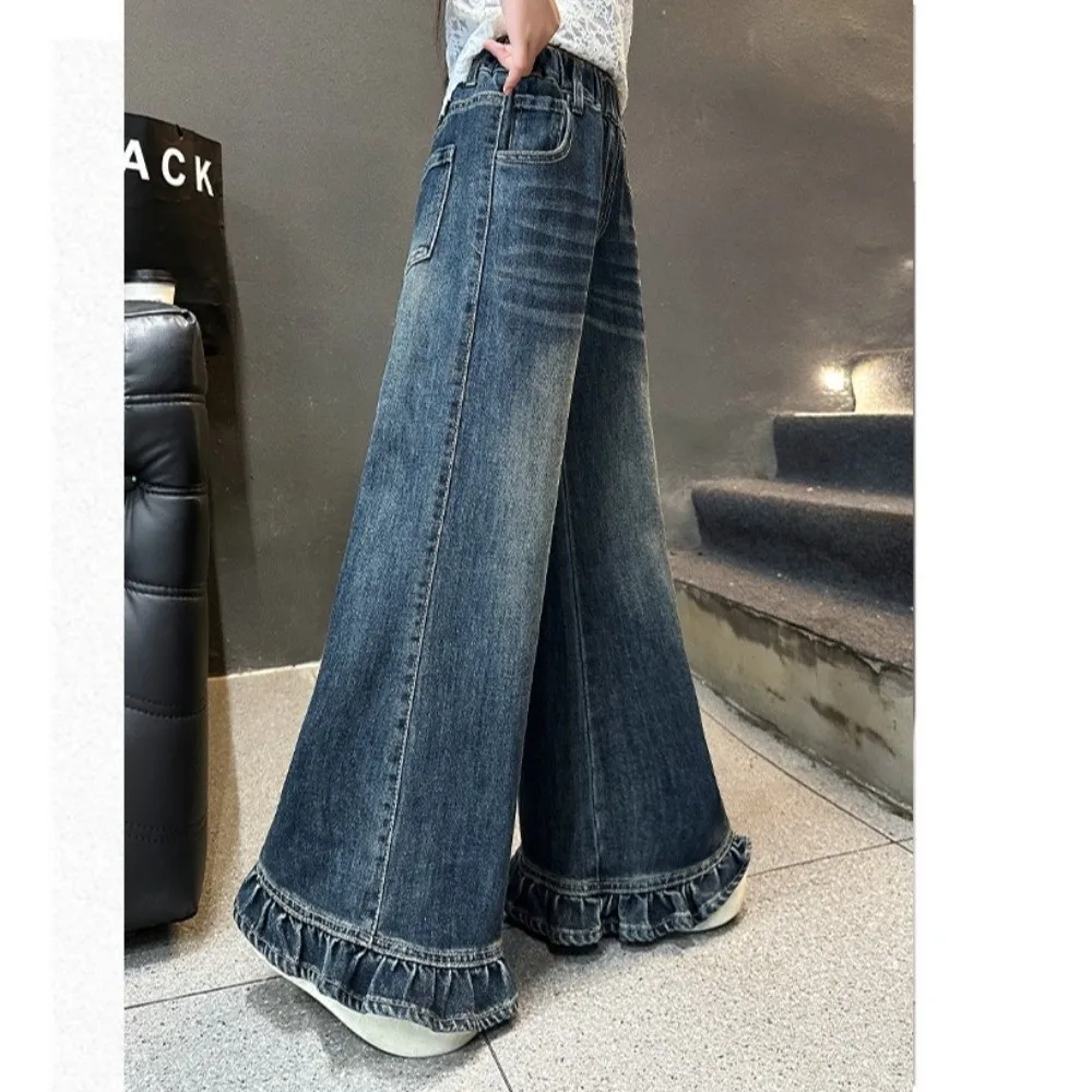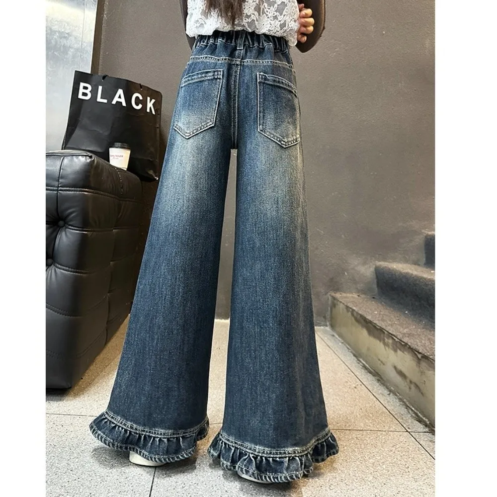 Wide Leg Pants Teen Girl Jeans Straight High Waist Children Ruffled Jeans Streetwear Cowboy Girls Denim Trousers Children