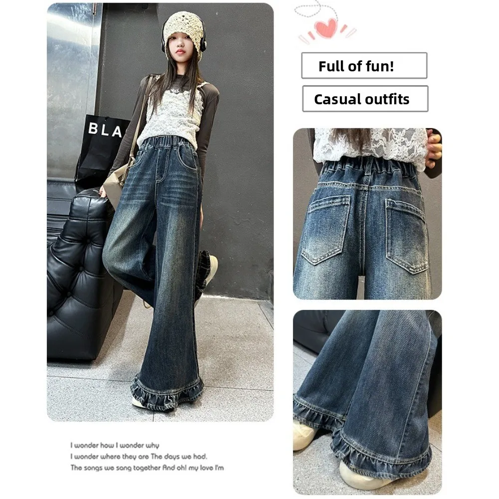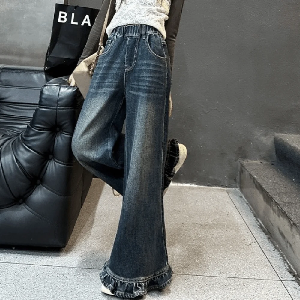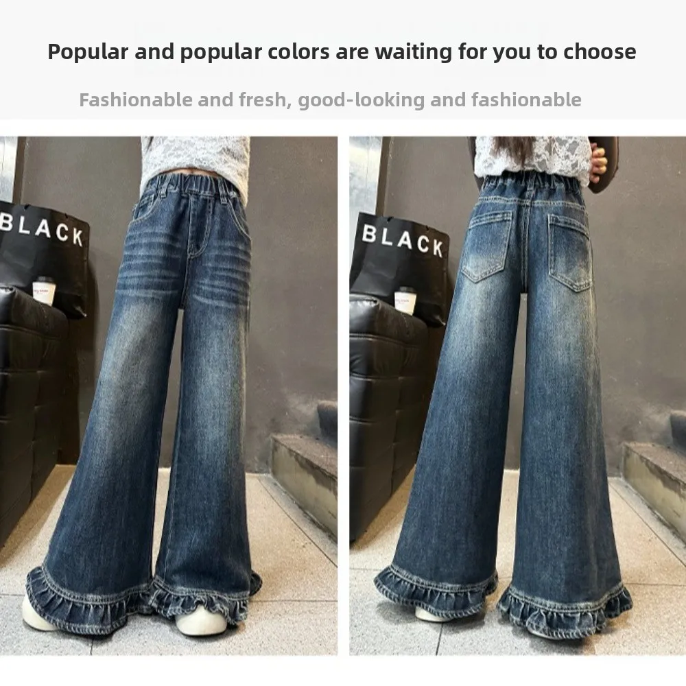 Wide Leg Pants Teen Girl Jeans Straight Long Loose Children Ruffled Jeans High Waist Streetwear Girls Denim Trousers Girls Gift